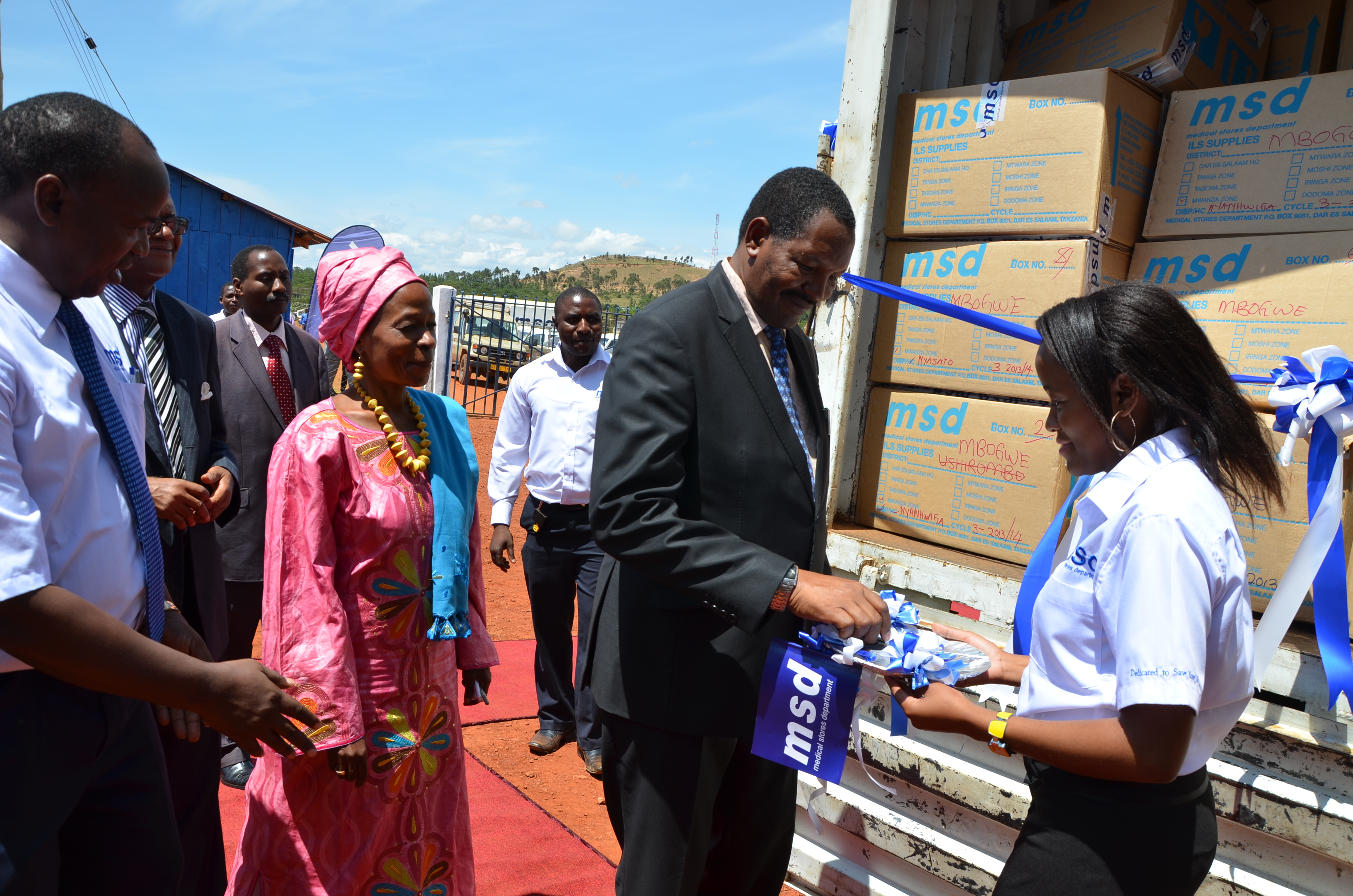 Deputy Minister for Health and social work cuts a ribbon to inaugurate the MSD Muleba sales point, beside is the minister for Land Housing and Human Settlement Development Prof Anna Tibaijuka(MP) observing the opening. Together Photo (Photo by Solomon Alfred – Tibaijuka’ private photographer) Place: Muleba, Kagera Date: 08-03-2014 Share on: