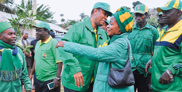 Katibu Mkuu wa CCM, Abdulrahman Kinana akilakiwa na Mbunge wa Muleba Kusini, Prof Anna Tibaijuka, baada ya kuwasili kwenye Kijiji cha Kyamkwikwi, wilayani Muleba mkoani Kagera 08/06/2015