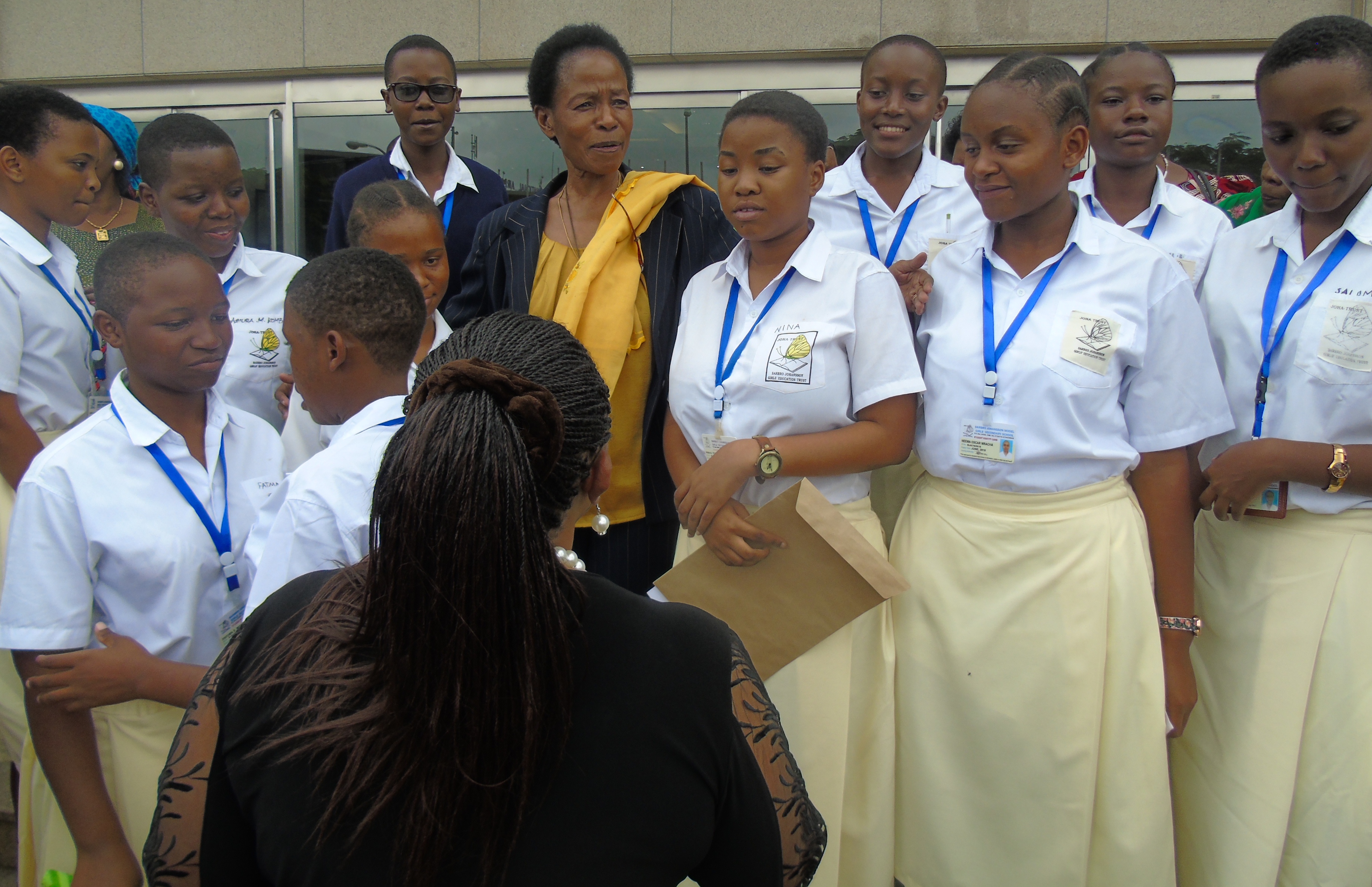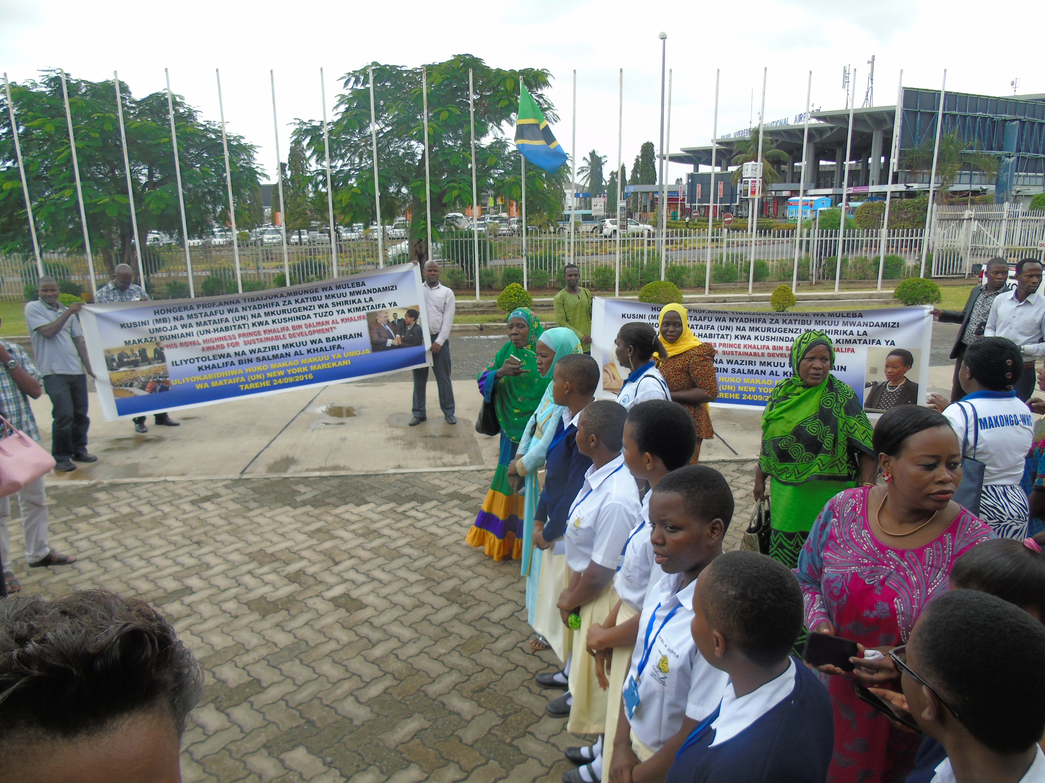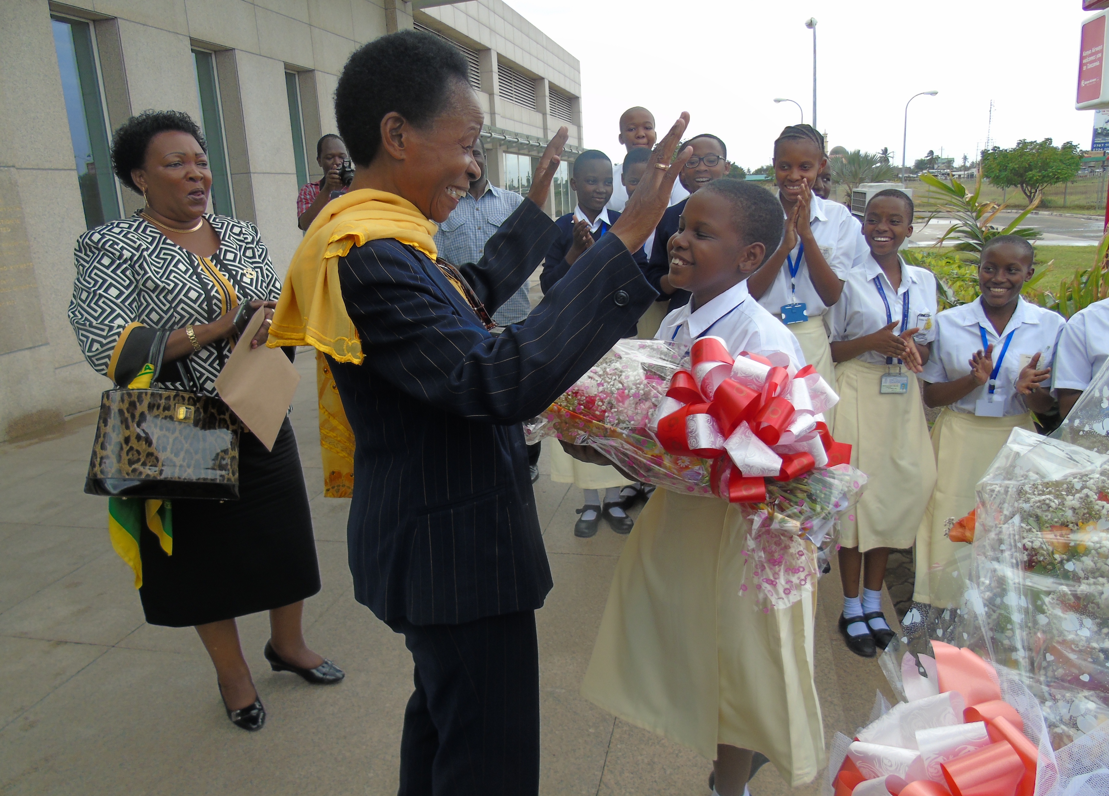 Professor Anna Tibaijuka receive bouquet of flowers shortly after she arrived at Julius Nyerere International airport in Dar es salaam Tanzania