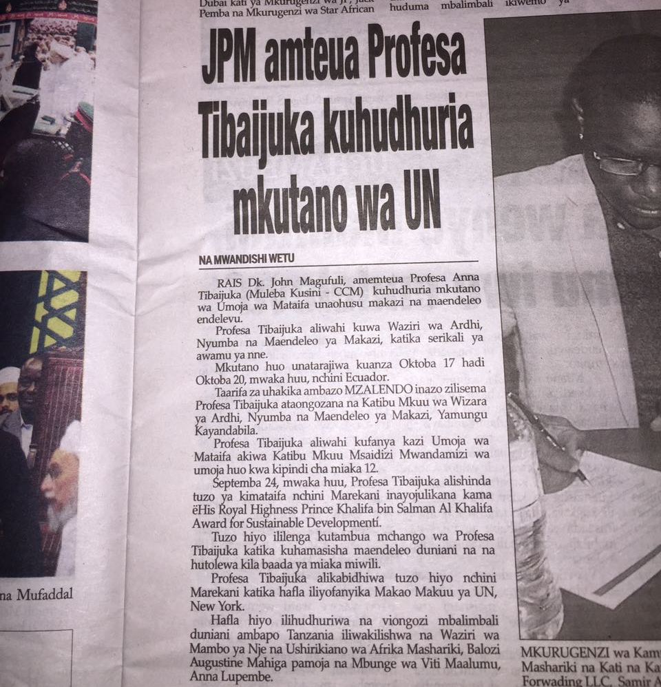 JPM amteua Prof Tibaijuka kuhudhuria mkutano a UN: Chanzo cha habari gazeti la Mzalendo